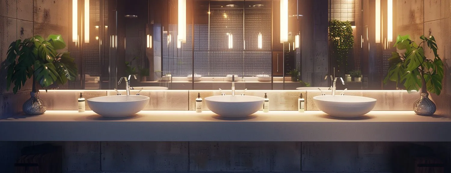 2. 4 глубокие раковины в общей комнате. Между сантехникой расстояние 40 см, чтобы расположить влажные полотенца.